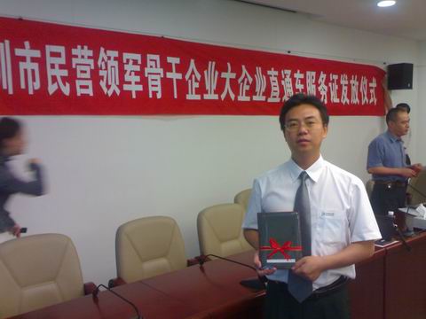 2007年8月,深圳市工贸局依据深圳市政府出台的《关于进一步加快民营经济发展的若干措施》规定,将我公司等61家“民营骨干企业”纳入大企业便利直通车服务名单,并于9月27日颁发了便捷服务“绿色通道”。